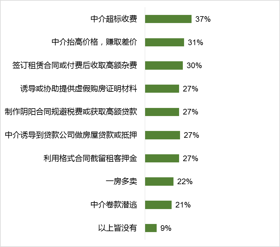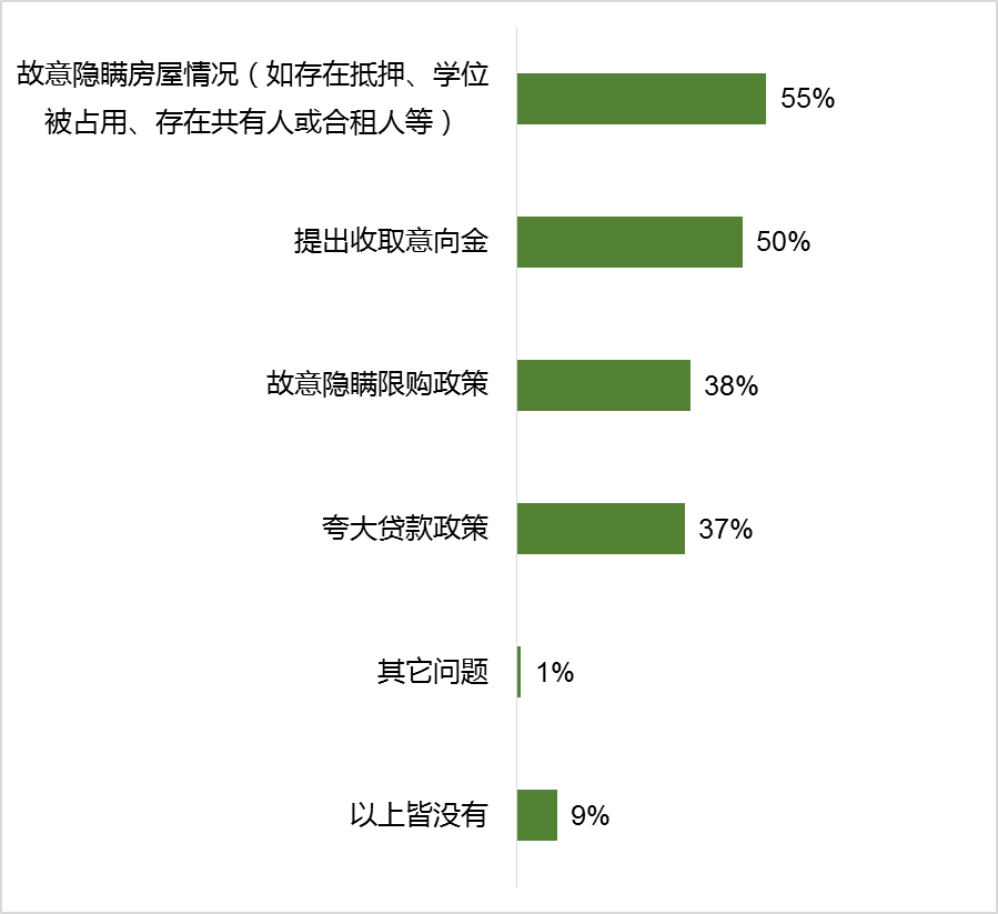 二是诱导或协助提供虚假购房证明材料。调查发现,消费者在交易过程中遇到中介诱导或协助提供虚假购房证明材料占27%。在实际体察中也发现,当体察志愿者表示没有购房资格时,有3名中介怂恿通过假离婚来获取购房资格。