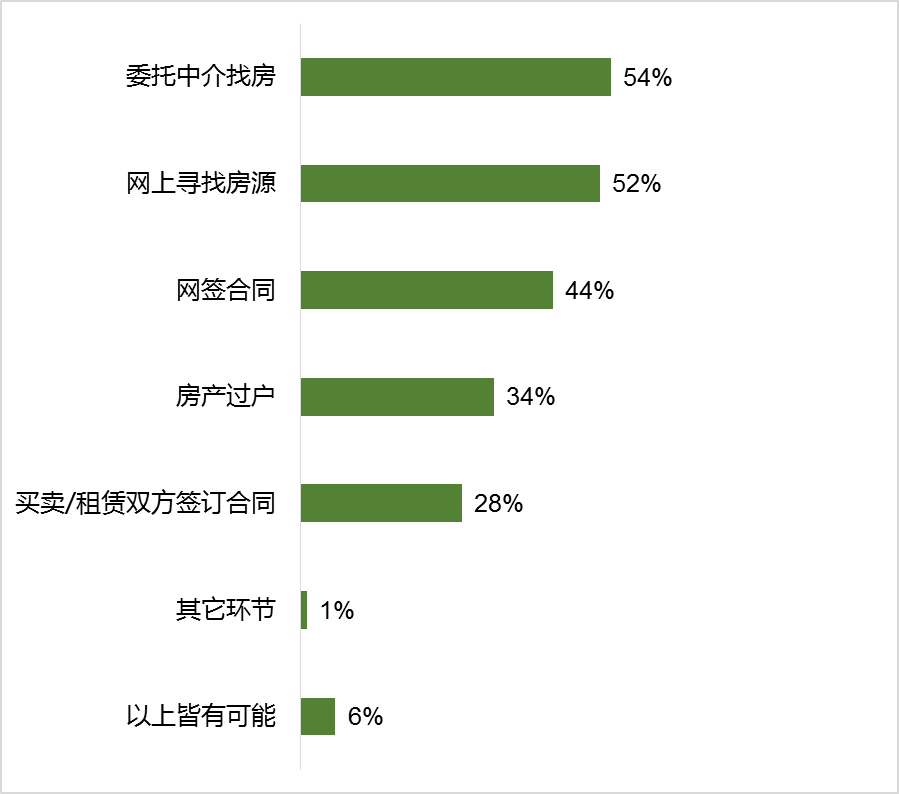 由于房地产交易涉及人员和环节较多,房地产交易成为个人信息泄露较严重领域,其中线上中介服务平台及中介公司是泄露源头。调查数据显示,76%的消费者认为在进行房屋买卖或租赁过程中个人信息被泄露。其中,54%的消费者认为在委托中介找房时可能被泄露;52%的消费者认为在网上寻找房源时可能被泄露;44%的消费者认为在网签合同时可能被泄露;34%的消费者认为在房产过户时可能被泄露;28%的消费者认为在买卖/租赁双方签订合同时可能被泄露。如图6所示。