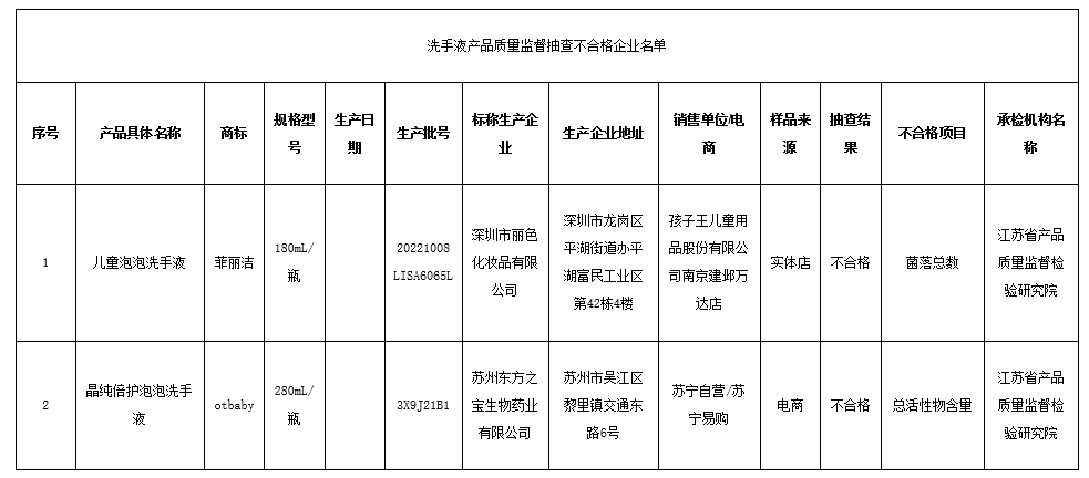 本次抽查结果显示,不合格项目为总有效物含量、微生物2项指标。其中深圳市丽色化妆品有限公司生产的商标为“菲丽洁”的1批次儿童泡泡洗手液样品被检出菌落总数项目不合格;苏州东方之宝生物药业有限公司生产的商标为“otbaby”的1批次晶纯倍护泡泡洗手液样品被检出总活性物含量项目不合格。