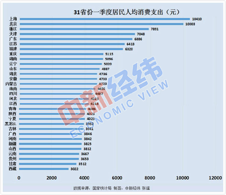 日前,国家统计局公布了31省份一季度人均消费支出,哪个省份最能“买买买”?又有哪些新的消费亮点?中新经纬客户端带你共同梳理。