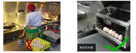 (三)清洗消毒禽蛋外壳。依据《餐饮服务食品安全操作规范》要求严格禽蛋类等食品的加工制作过程。使用鸡蛋前,应清洗干净蛋的外壳,必要时消毒外壳。破蛋时应将鸡蛋单独存放在暂存容器内,确认鸡蛋未变质后再合并存放。盛放或加工制作蛋类原料、畜肉类原料及禽肉类原料的工具和容器宜分开使用。