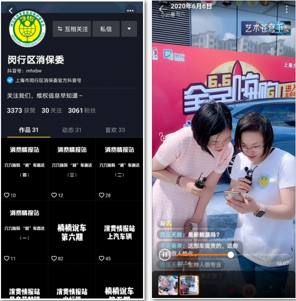 ▲闵行区消保委抖音号开设“消费情报站”、“楠楠说车”专栏,传播消费知识和消费资讯