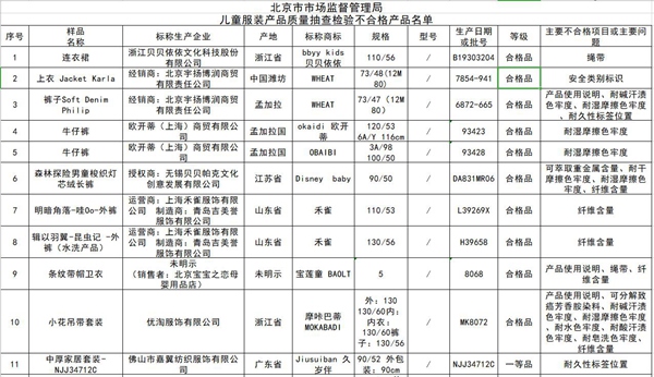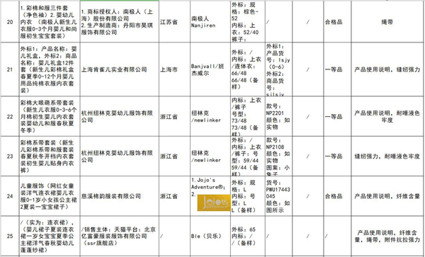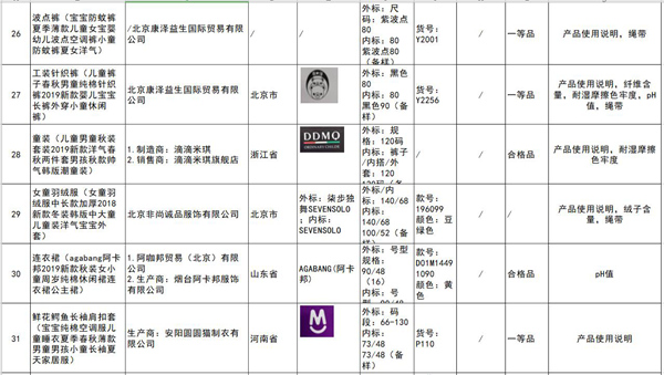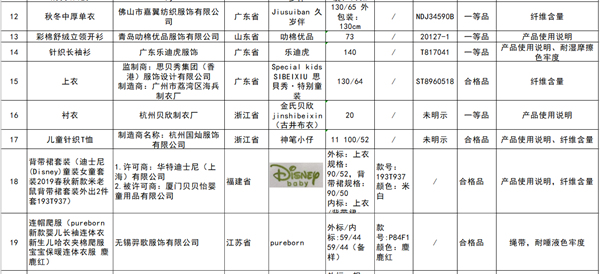 儿童服装产品质量抽查检验不合格产品名单显示,市场上所销售的儿童服装主要不合格项目或主要问题依次为产品使用说明不合格、纤维含量不合格,耐湿摩擦色牢度不合格。其中,商标为“南极人”的彩棉和服三件套、婴幼儿内衣 (南极人新生儿衣服0-3个月婴儿和尚服初生宝宝套装)存在绳带不合格的问题,商标授权人为南极人(上海)股份有限公司,生产制造商为丹阳市昊琪服饰有限公司。商标为Disney Baby(迪士尼宝宝))的背带裙套装(童装女童套装2019春秋新款米老鼠背带裙套装外出2件套)存在产品使用说明,纤维含量不合格的问题,商标许可商为华特迪士尼(上海)有限公司,被许可商为厦门贝贝怡婴童用品有限公司。