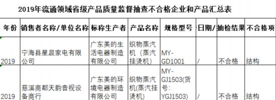 其中,由宁海县星晨家电有限公司销售、广东美的生活电器制造有限公司生产的织物蒸汽机(蒸汽挂烫机)抽检显示结构项目不合格,规格型号为MY-GD1001。由慈溪商都天韵音视设备商行销售、广东美的环境电器制造有限公司生产的织物蒸汽机(蒸汽挂烫机)抽检显示结构项目不合格,规格型号为MY-GJ1503(货号:YGJ1503)。