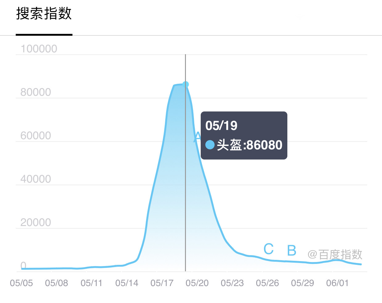 百度搜索指数显示,5月份,互联网用户对“头盔”关键词搜索关注程度呈抛物线趋势,最高值出现在5月19日。