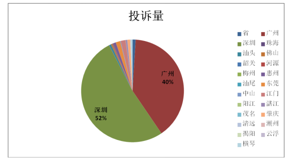 与近年情况类似,2020年上半年广东全省消费投诉地区分布仍极不平衡,广州、深圳两市处理消费者投诉高达185426件,占全省总量的91.43%(详见图2),较2019年上半年上升22.49%。