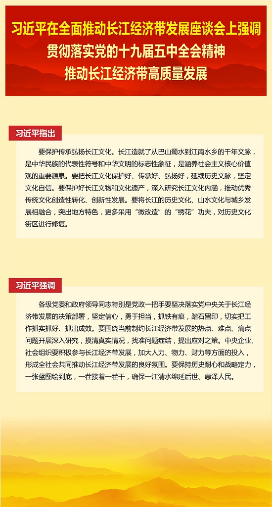 习近平指出,要保护传承弘扬长江文化。长江造就了从巴山蜀水到江南水乡的千年文脉,是中华民族的代表性符号和中华文明的标志性象征,是涵养社会主义核心价值观的重要源泉。要把长江文化保护好、传承好、弘扬好,延续历史文脉,坚定文化自信。要保护好长江文物和文化遗产,深入研究长江文化内涵,推动优秀传统文化创造性转化、创新性发展。要将长江的历史文化、山水文化与城乡发展相融合,突出地方特色,更多采用“微改造”的“绣花”功夫,对历史文化街区进行修复。