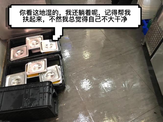 1. 厨房地面潮湿,杂乱。