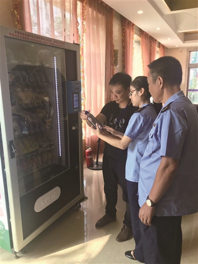 鹿城区市场监管局执法人员正在对无人食品售货机进行抽检。